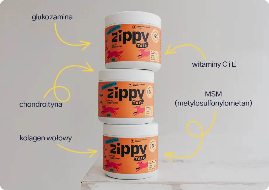 🐾 glukozamina, MSM, siarczan chondroityny, kolagen wołowy – wspierają ruchomość i regenerację chrząstki