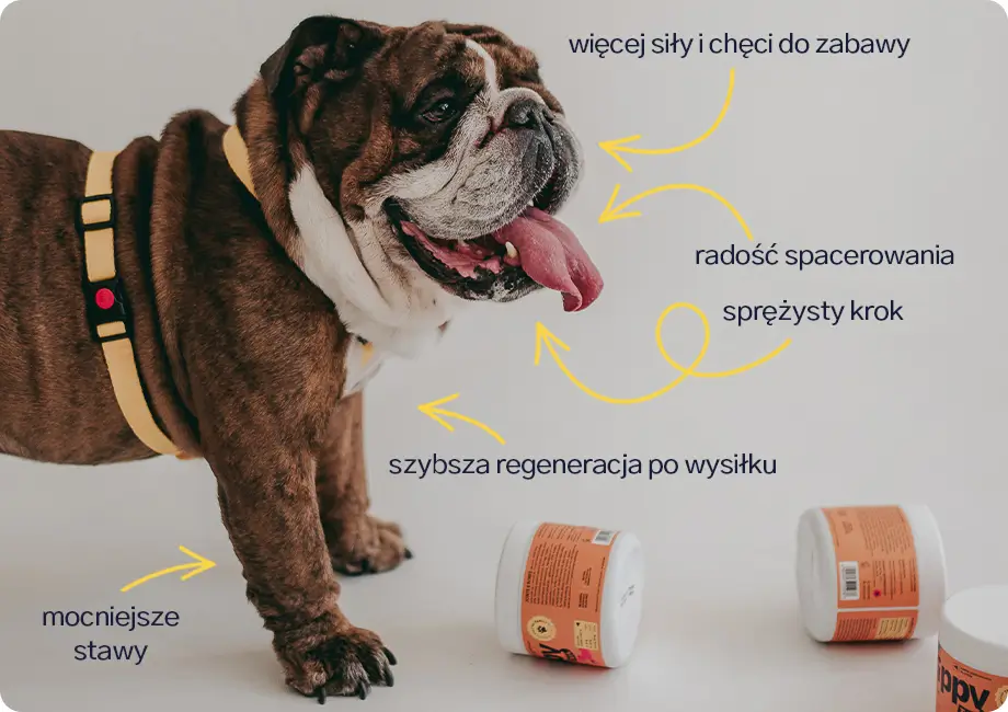 Suplement diety JOINTS & BONES wspiera chrząstkę stawową, tkanki okołostawowe, ścięgna i więzadła podczas codziennej aktywności oraz pomaga w lepszej i szybszej regeneracji po wysiłku. Twój pies będzie skakał z zachwytu!