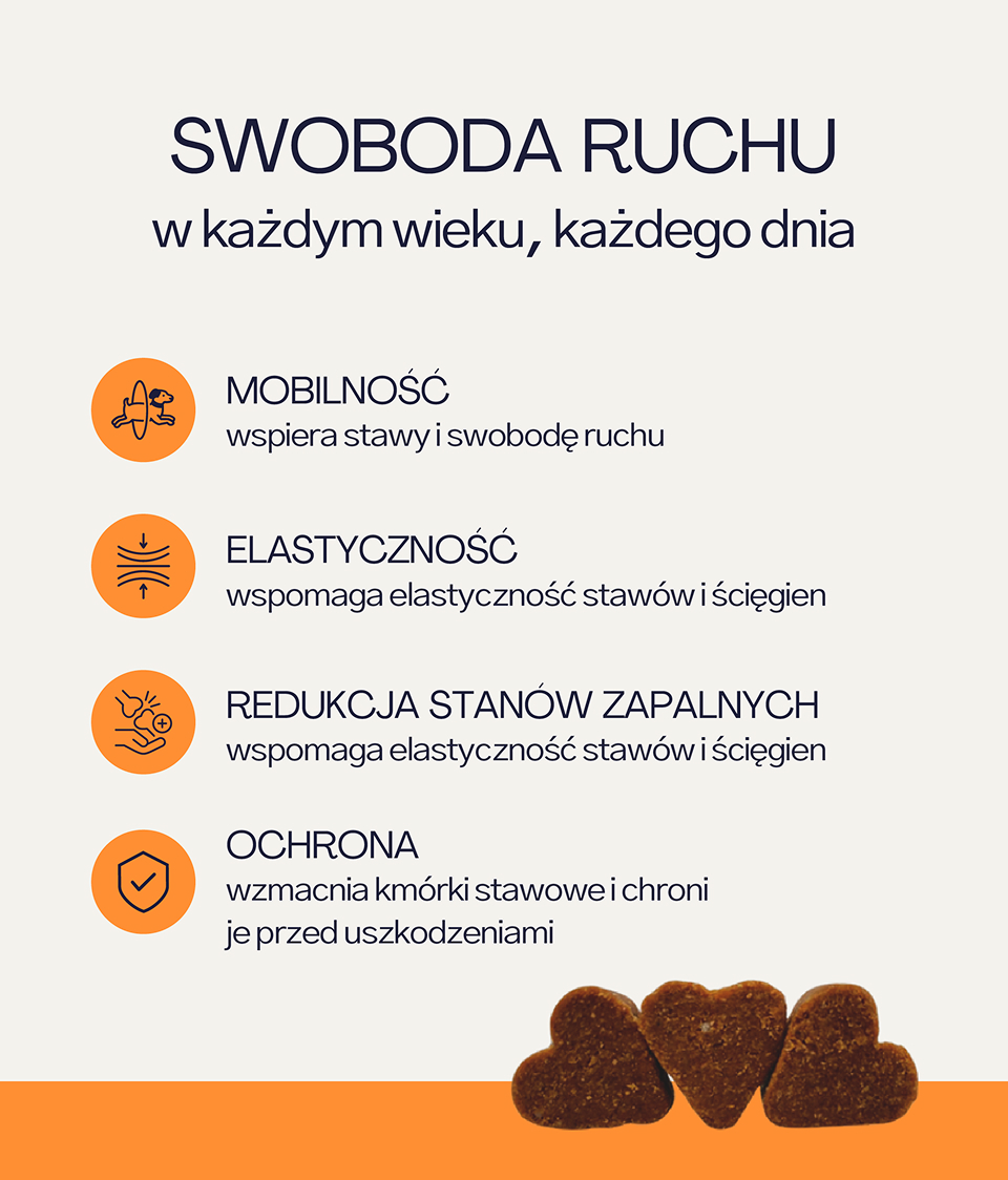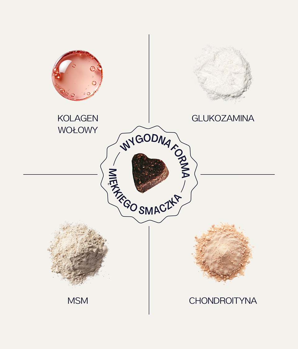 🐾 glukozamina, MSM, siarczan chondroityny, kolagen wołowy – wspierają ruchomość i regenerację chrząstki