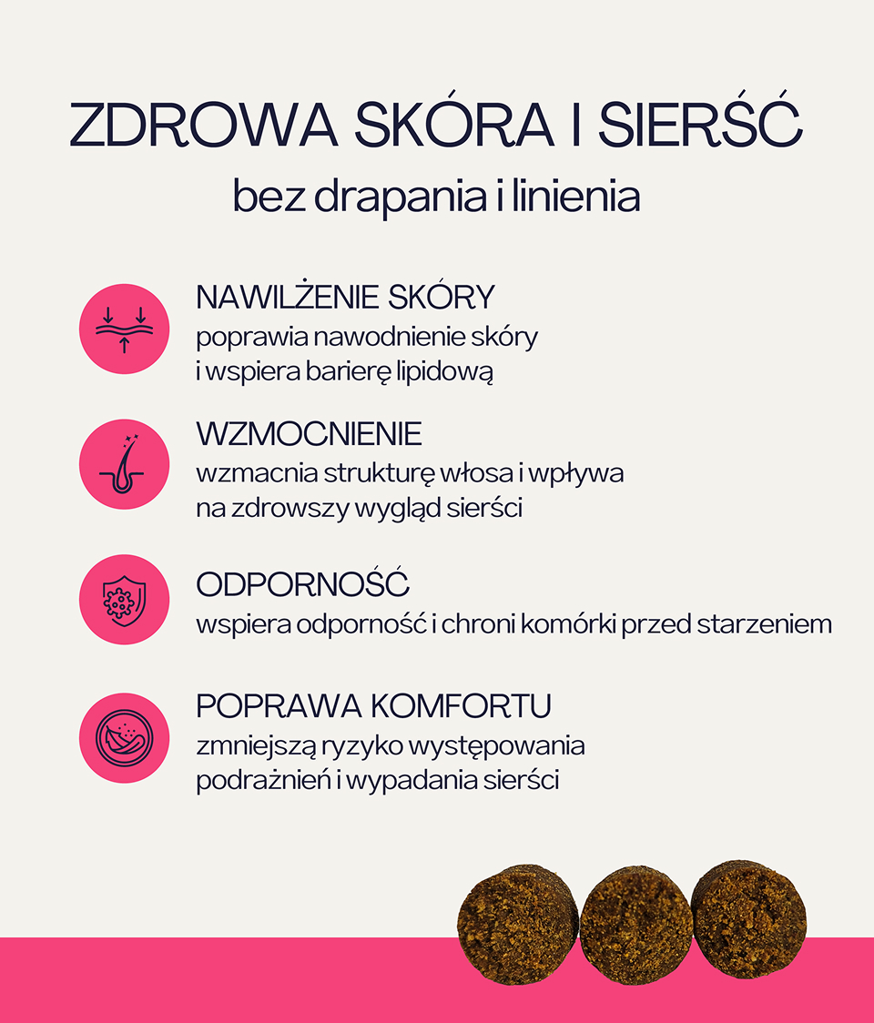 Naturalne źródła białka, kwasów tłuszczowych i antyoksydantów wspierają skórę, sierść i odporność.