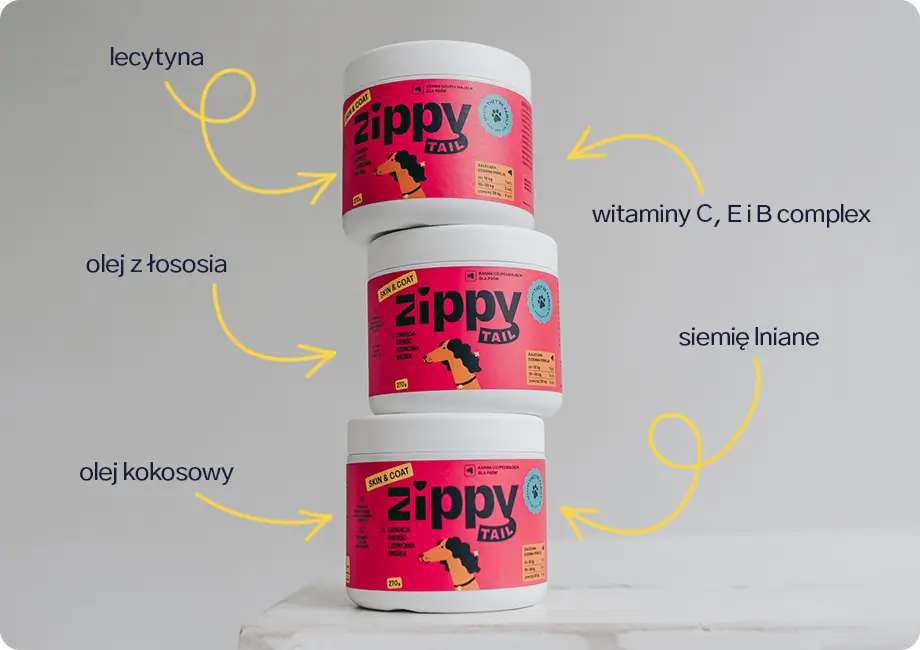 🐾 witaminy z grupy B i lecytyna – wspomagają metabolizm skóry i wzrost zdrowej sierści